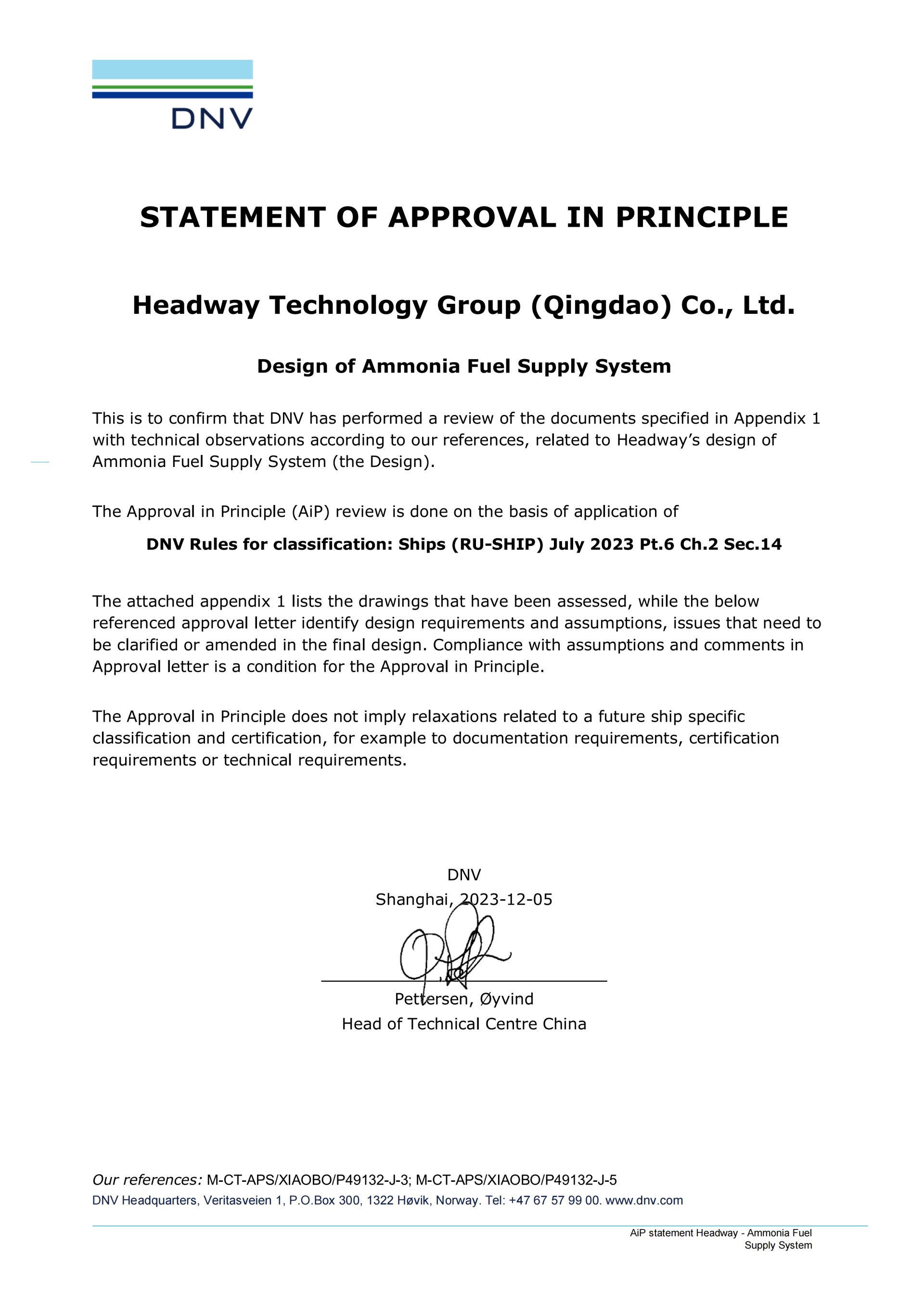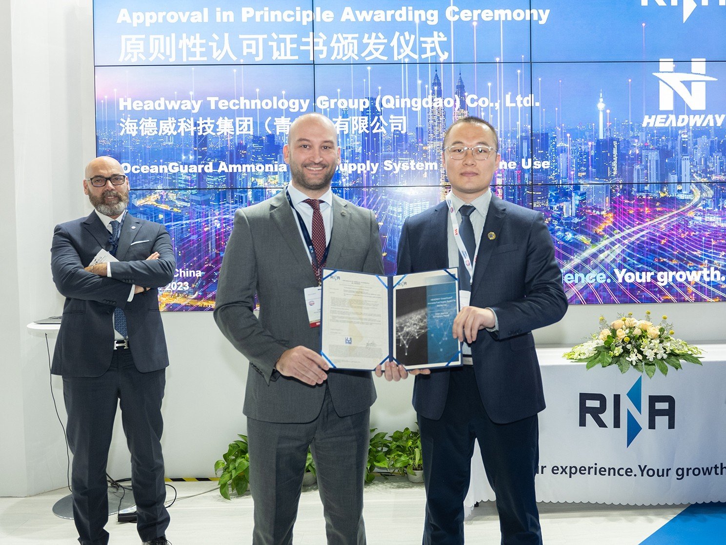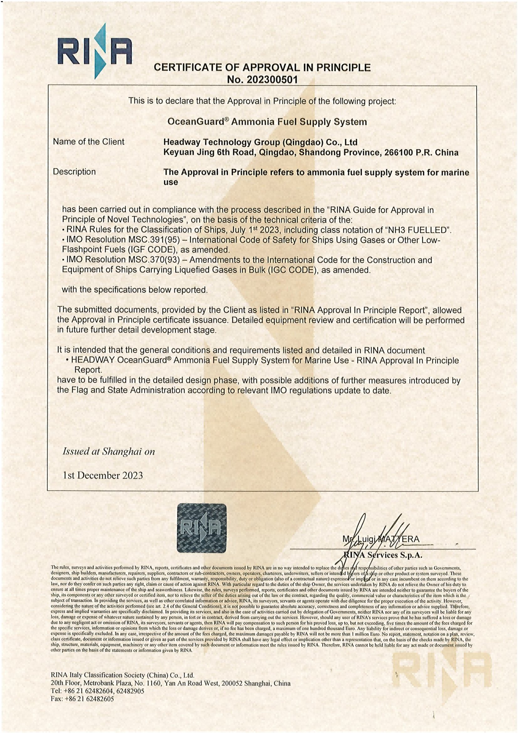 2023年中国国际海事会展上,海洋卫士®氨燃料供给51漫画正式取得DNV船级社和RINA船级社授予的原理认可证书,标志着51漫画 低碳航运产品生态再度扩军并取得业界权威认可。